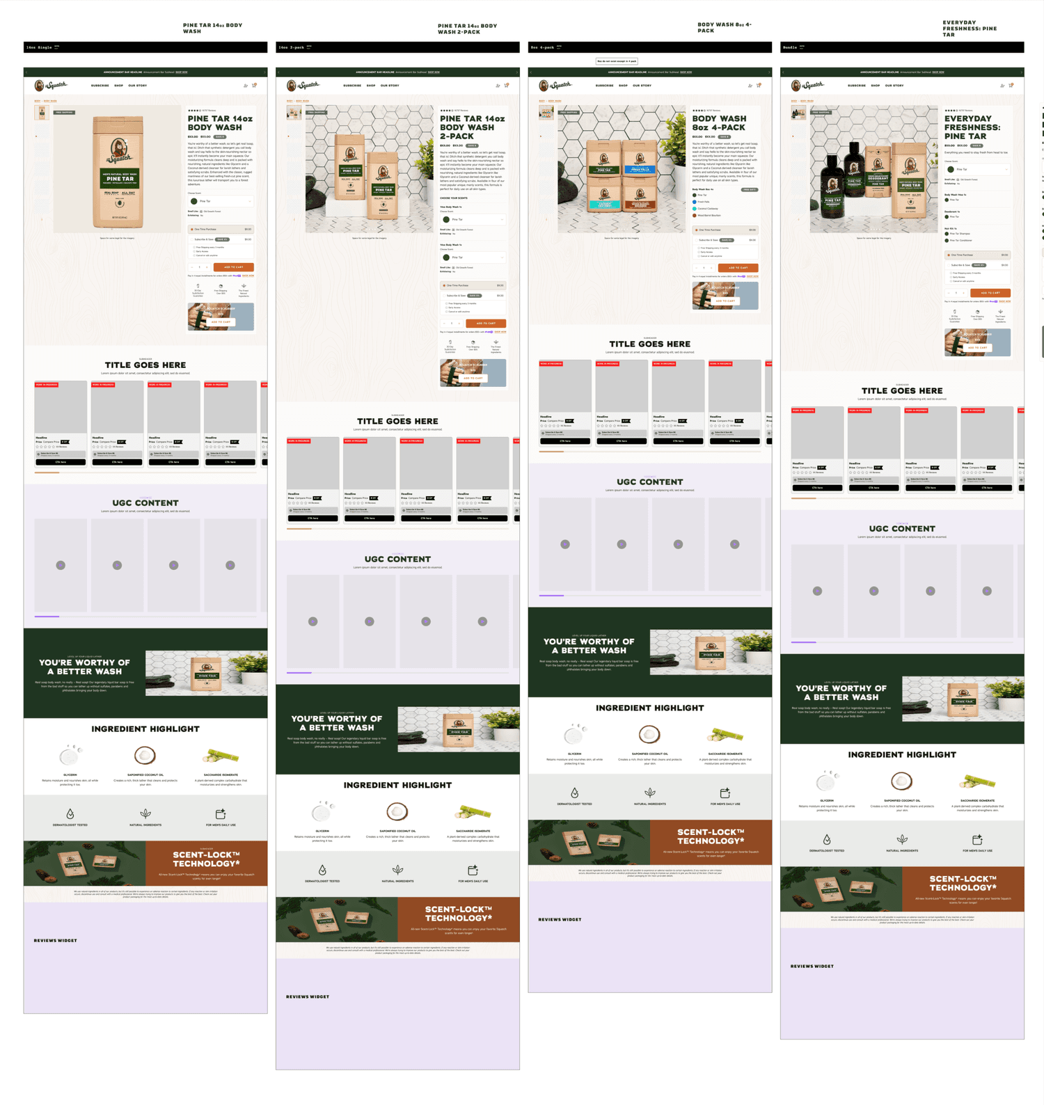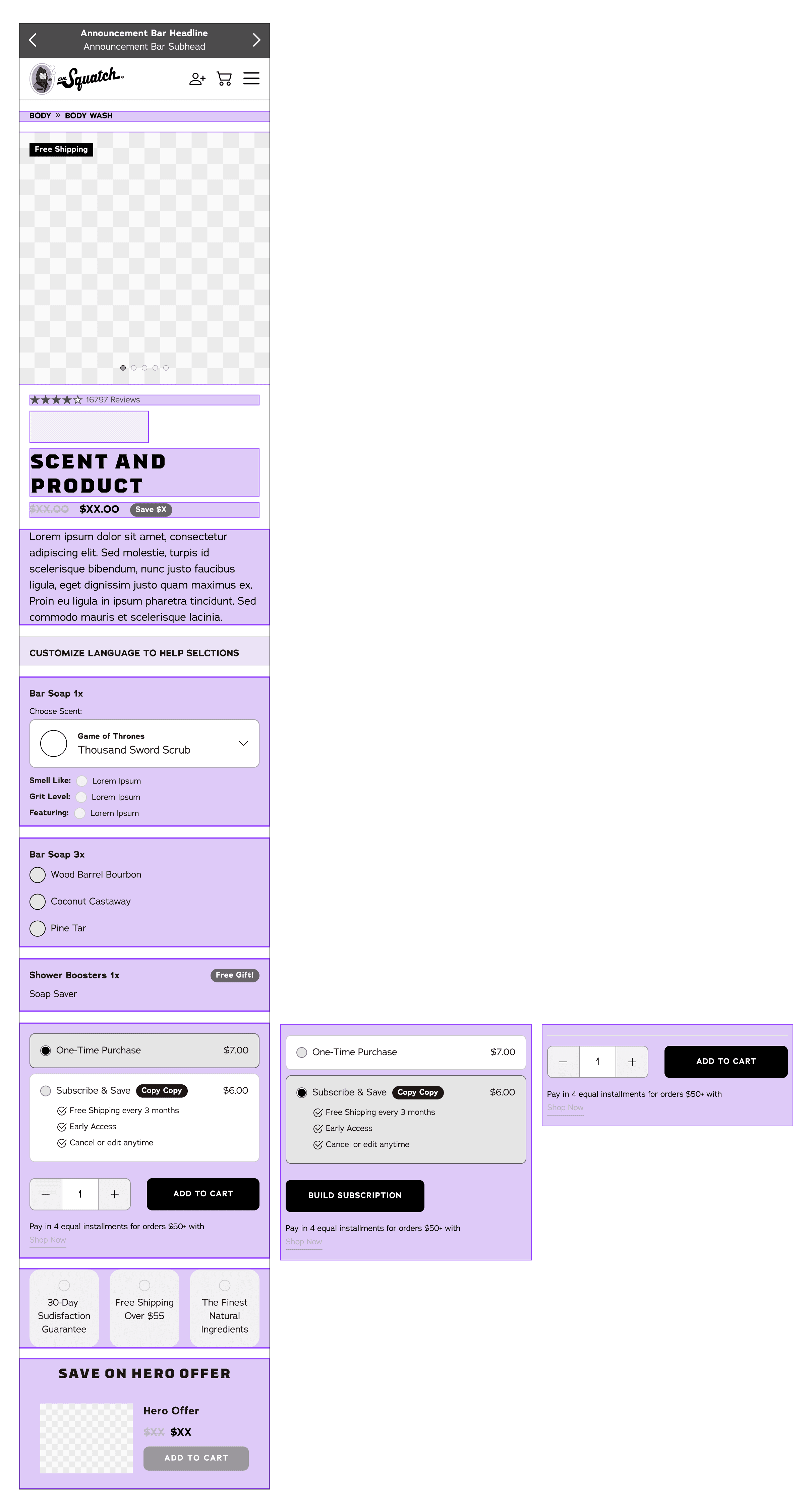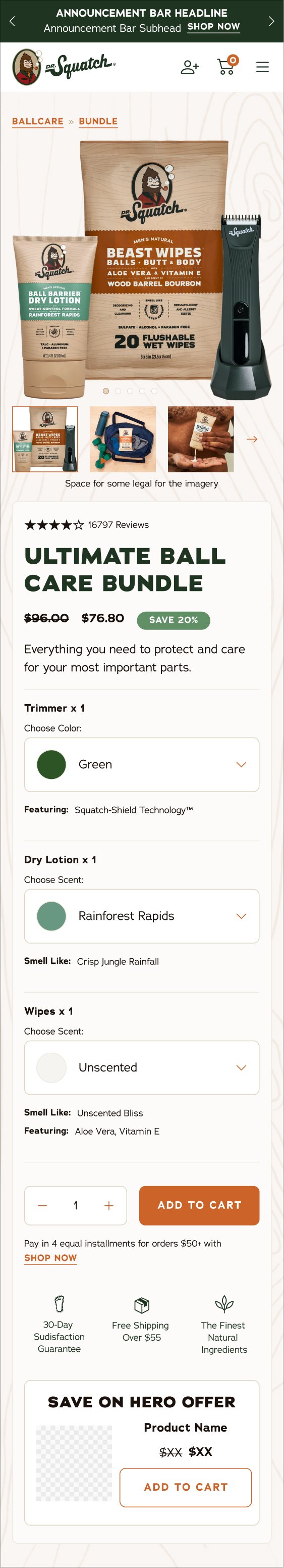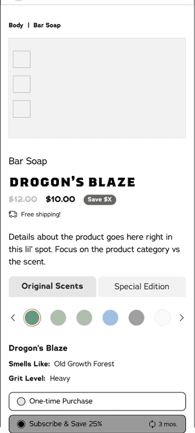 Dr. Squatch was launching a new category men’s personal hygiene (quickly followed by another new product Body Wash) which required a new PDP user interface. It was the Buy Box area that specifically need to be revamped so that there was the ability to select multiple options of scents, colors, and more for bundles and products.
