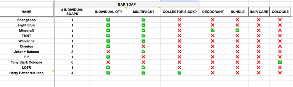 For the first time matrixes were created (by me and my product manager) that detailed all categories, all products, all scents/flavors/colors, and all purchasing combinations).
