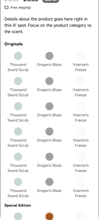 We explored having all scents visible within the PDP. For bar soaps the max amount for Core Scents was 16. We quickly realized this would be far too many scents in one space.