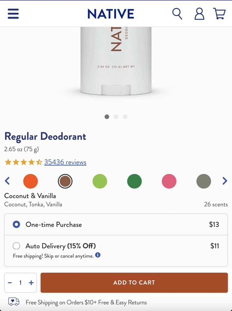Native was a north star in great user experience. They allow users to select scents on the PDP page, their subscription process is simplified, and they allow users to select their own quantity.