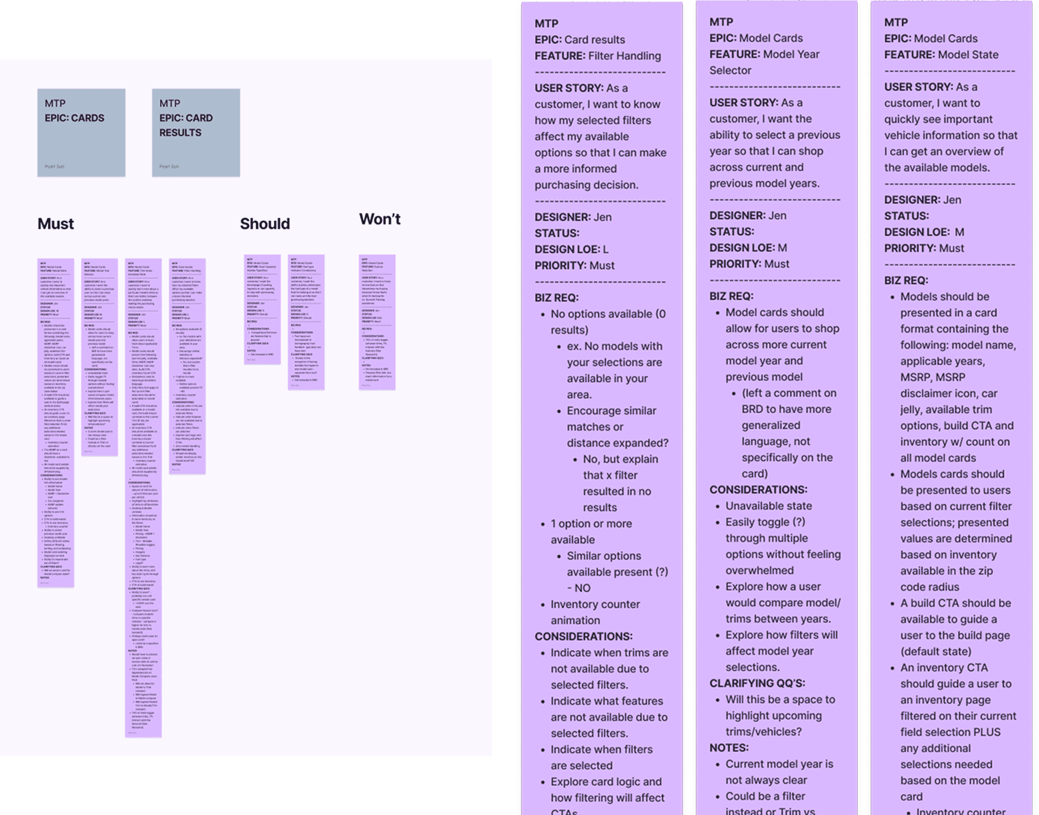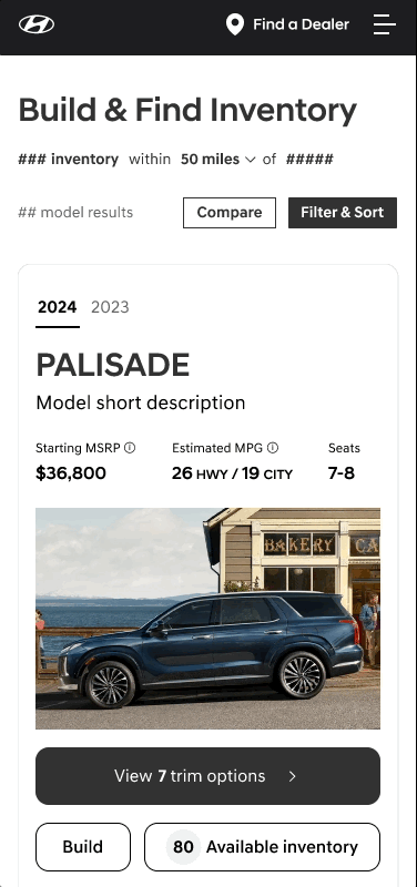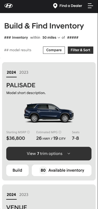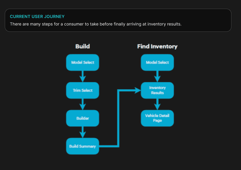 The current model of car buying user journey is to select a model card, then a trim card, which then go to the inventory page where there are inventory cards. This segmented process causes a lot of steps without a lot of reward. It also doesn’t allow consumers to compare models and trims based on filter selections.