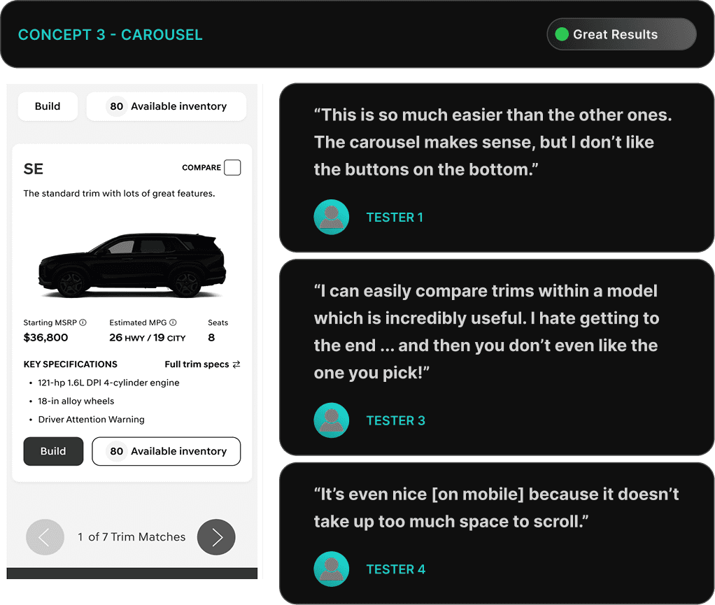 75% of testers preferred the Carousel layout overall for the ease in the ability to compare using a side-by-side layout with the availability of key specs.