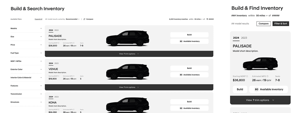 Unfortunately most vehicle websites force consumers to pick a model, then a trim, taking them down the funnel of inventory of car purchasing without a lot of filters or information to help them make their decisions along the way. This also doesn't allow for model-to-model comparisons. The lack of filtering options also hurts a consumer's ability to make an educated decision, and often takes them down a convoluted journey to a vehicle they may not be interested in.