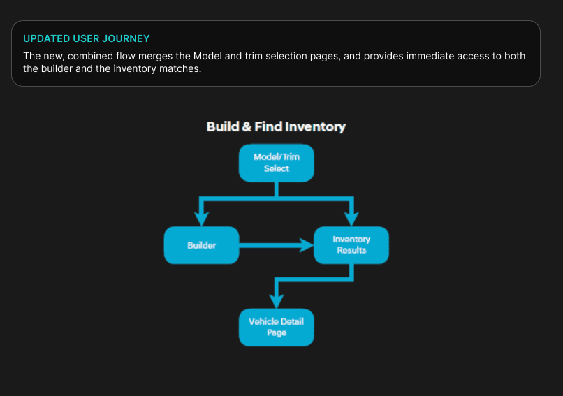 The current journey was very arduous & layered, focusing users to make selections with little to no benefits or the ability to change those selections. The updated the user journey takes the consumer directly to builder or inventory to help flatten the process.